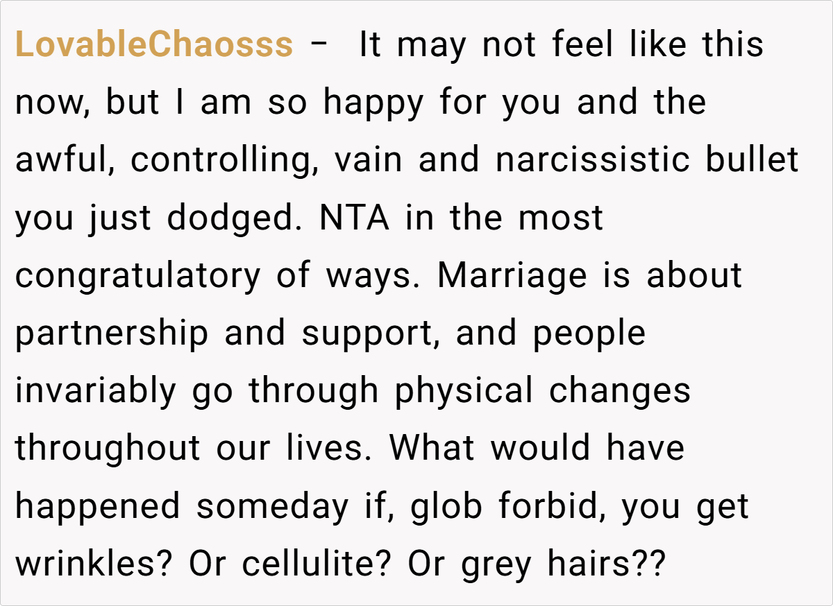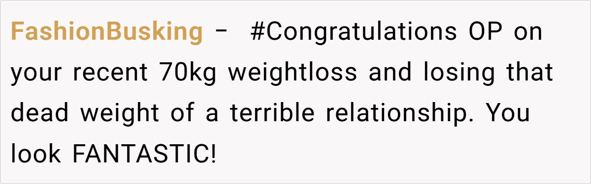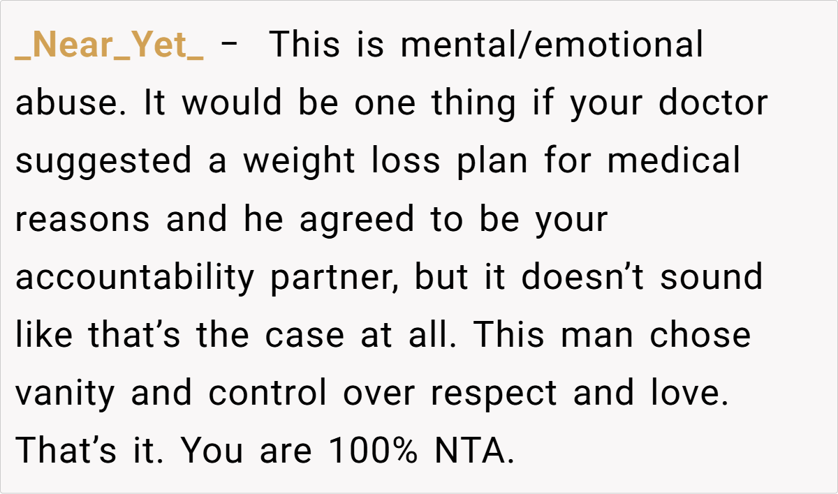 Relationship and boundary-setting expert Dr. Emily Reynolds explains, “When one partner uses an ultimatum that targets your insecurities—especially regarding something as personal as weight—it becomes less about safety and more about control. Refusing to expose yourself in a way that makes you feel vulnerable is a completely reasonable boundary.” Dr. Reynolds adds that healthy relationships are built on mutual respect and support,