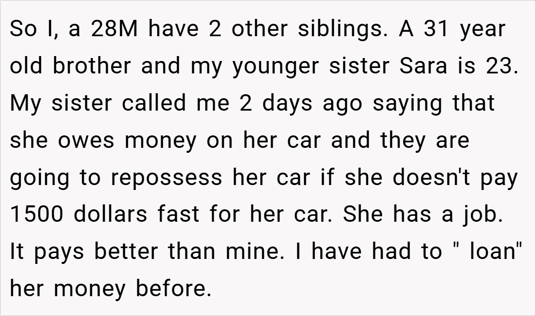 Family financial dynamics can be tricky, especially when repeated requests collide with personal goals. I (28M) have two siblings—a 31-year-old brother and my younger sister, Sara (23F). Two days ago, Sara called me in distress, saying she owed money on her car and needed $1,500 quickly to avoid repossession.