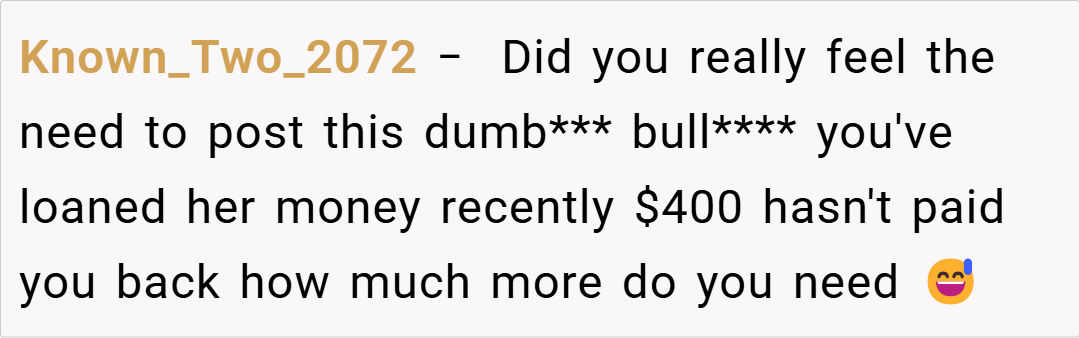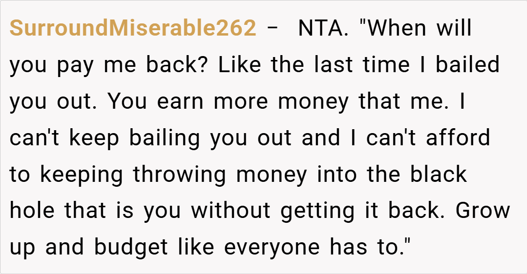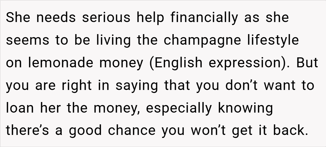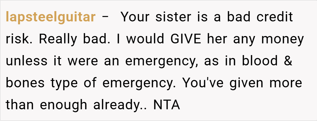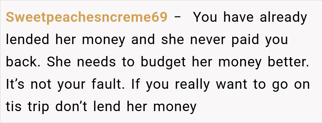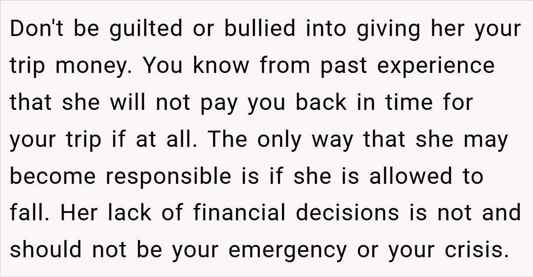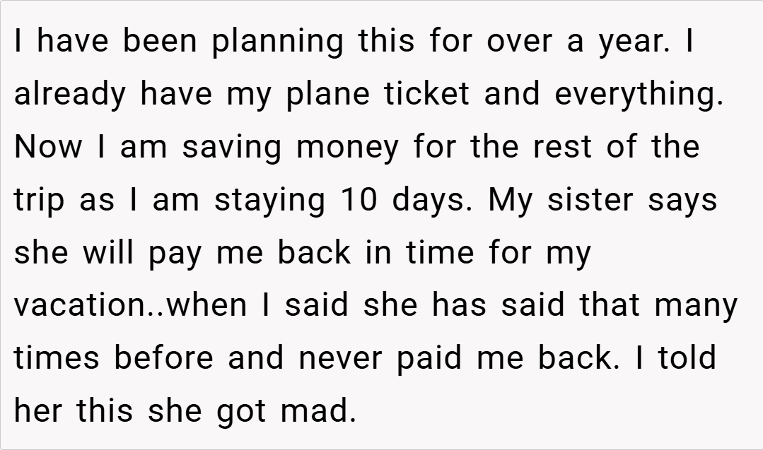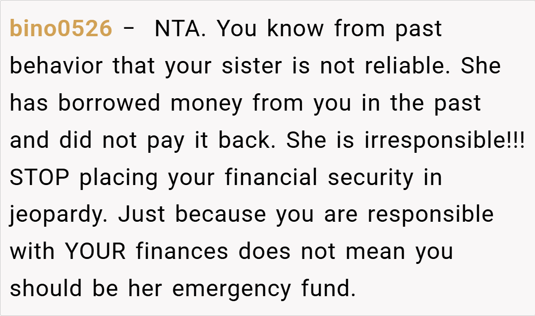 Several redditors expressed strong support for your stance. One user commented, “If your sister has a habit of borrowing without repaying, you’re not the asshole for saying no. You need to take care of your own financial goals first.” Another shared, “Family comes first, yes, but not at the expense of your own future. You’ve been let down before—don’t jeopardize your long-planned vacation for money that may never be repaid.”