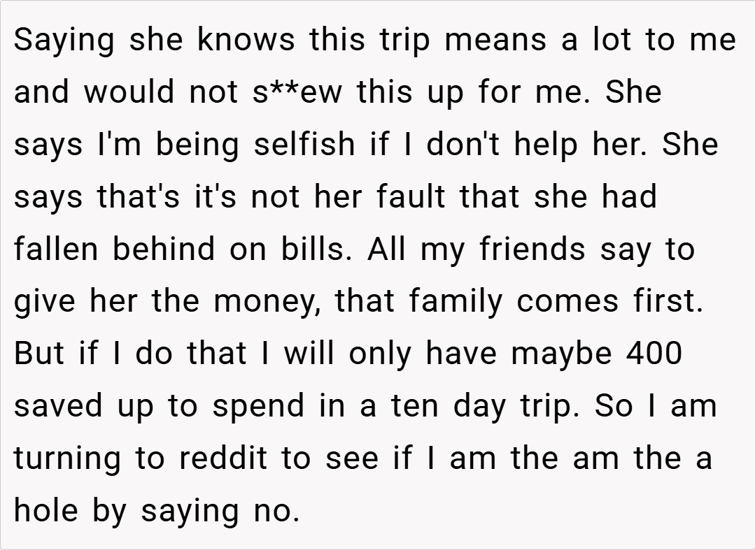 I’m now torn between family loyalty and my own financial priorities. While she promises to repay the money in time for my trip, I’ve heard similar assurances before, and it never materialized. So, I’m left wondering: Am I the asshole for refusing to lend her the money, even though all my friends insist that family comes first?