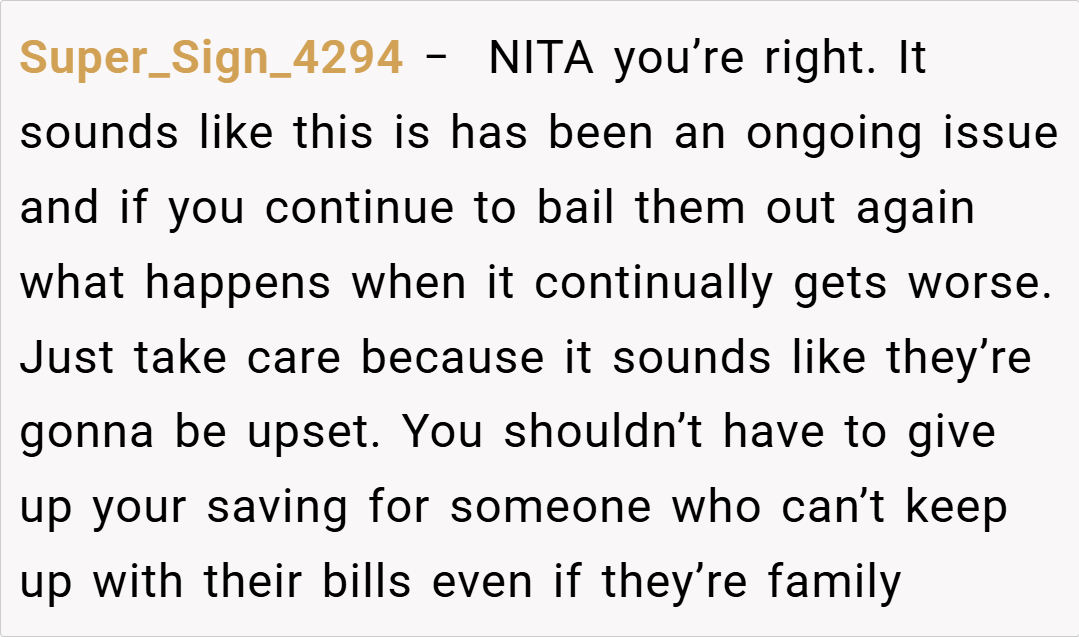 She continues, “Your decision to prioritize your vacation savings over lending money in a pattern of non-repayment is a healthy financial choice. While family loyalty is important, it must be balanced with personal responsibility.”
