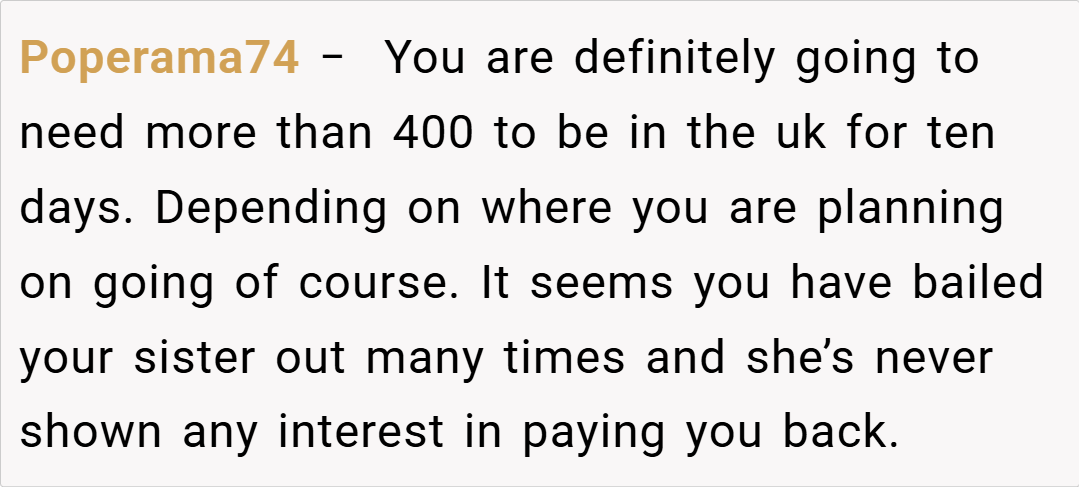 Despite having a well-paying job (which, notably, earns more than mine), she’s repeatedly borrowed money from me for rent, phone bills, and even a $400 electric bill—amounts she never repaid and that I ultimately wrote off. With my parents unable to help and my brother tied up with his own family, I’ve been saving up for a long-planned vacation to England next March.