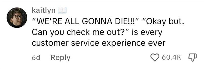 “Every customer service experience ever”: online have found some humor in the story, noting how it shows the realities of customer service—Joanne, unaware of the tragedy unfolding, insisted on completing her purchase despite the chaos