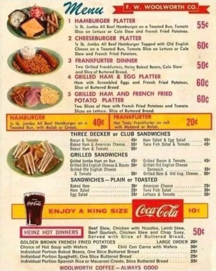 For instance, in the 1960s, McDonald’s meals were less than $4—unthinkable in today’s world of $15 fast food combos. A diner menu from the same era showed that nothing cost more than a dollar.