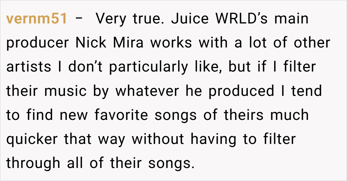‘LPT: If you liked a song by an artist but did not find the other tracks by the artist to your liking, look up the producer and see his other works. Producers have a lot of say in how the final product turns out.’