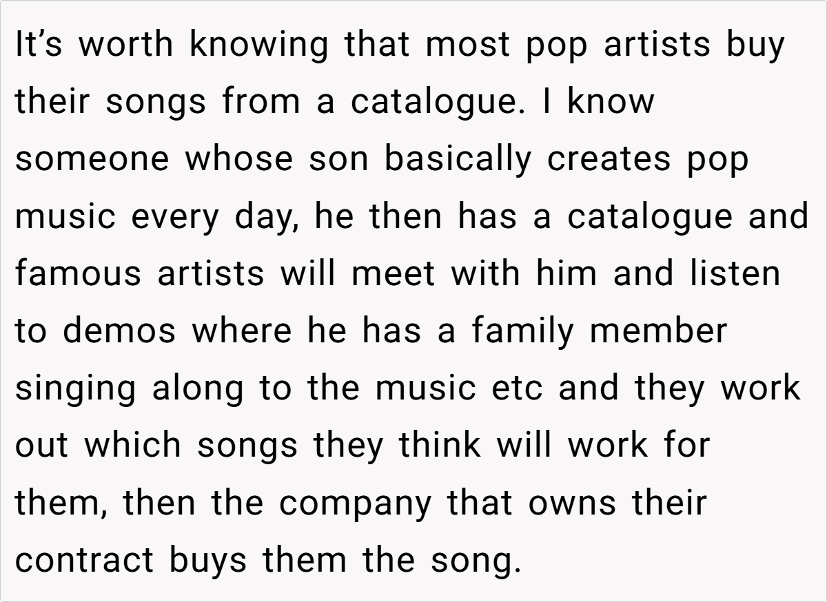 Delving deeper, we see a conflict between the marketed myth of personal struggle and the calculated craft of production. While the public is regaled with stories of a star pouring raw emotion into a song, the reality is sometimes more prosaic—a selection from a ready-made repository of tunes.