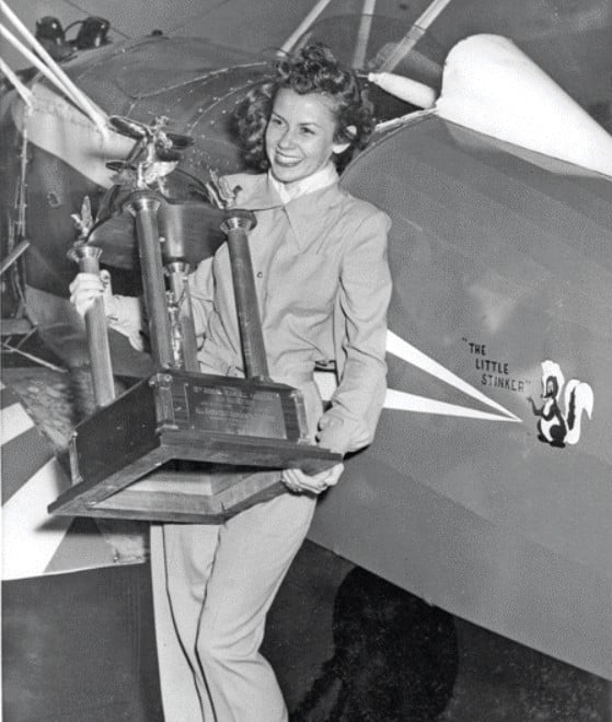 In 1946, she bought her own biplane, 1929 Great Lakes 2T-1A Sport Trainer biplane, and performed at the Southeastern Air Exposition, kicking off her pro aerobatic career. Skelton could do lots of tricks, but her most impressive maneuver involved flying upside down and cutting a ribbon with her propeller just 10 feet off the ground.