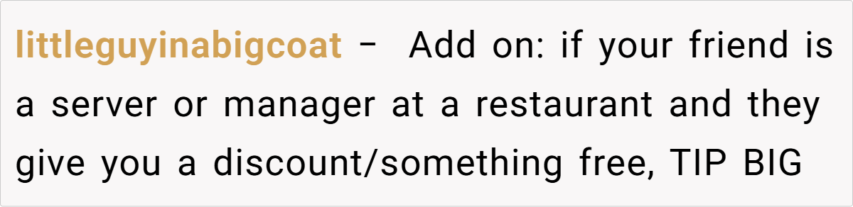 These opinions capture a range of experiences, from those who tip generously to those who firmly believe that friendship should never compromise fair pricing. They reflect the ongoing debate: is a discount a token of goodwill, or does it undermine the true worth of a service? The community’s diverse perspectives invite us to consider the complexities behind each transaction, prompting further discussion on where to draw the line between generosity and business pragmatism.