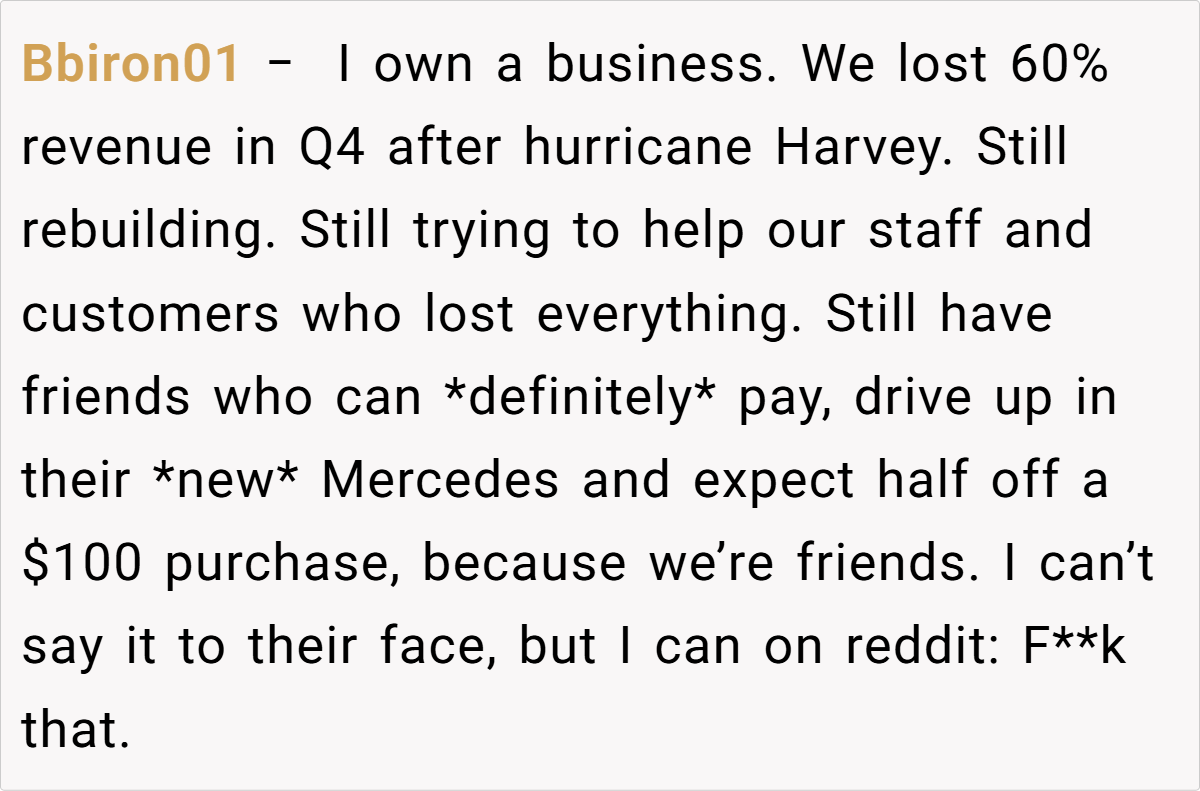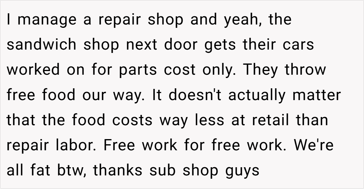 Transitioning from the specific to the general, it’s worth noting that the pressure to provide freebies is not confined to one industry. Across various sectors—from repair shops to restaurants—the expectation of “friend discounts” can lead to financial strain and diminished morale among employees.