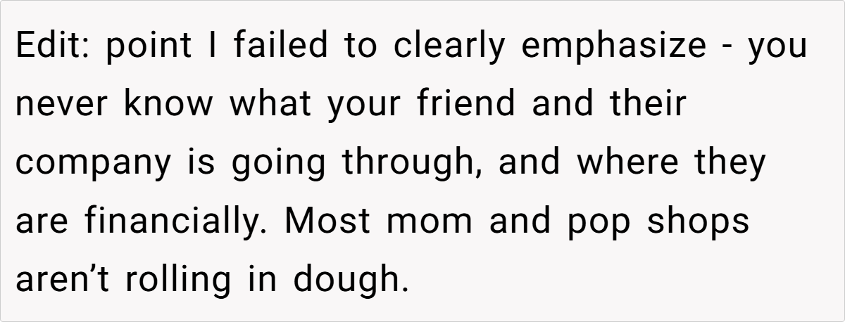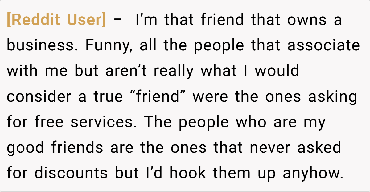 In a candid and humorous way, the original poster reveals the delicate balance between friendship and business—a balance that’s sometimes tipped too far. The narrative immediately draws you in with its frank, relatable tone and a dash of cheeky humor that hints at the absurdity of expecting freebies simply because you’re pals.
