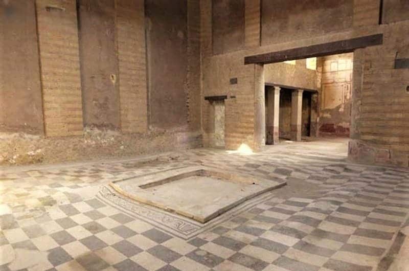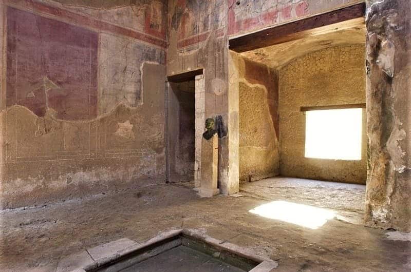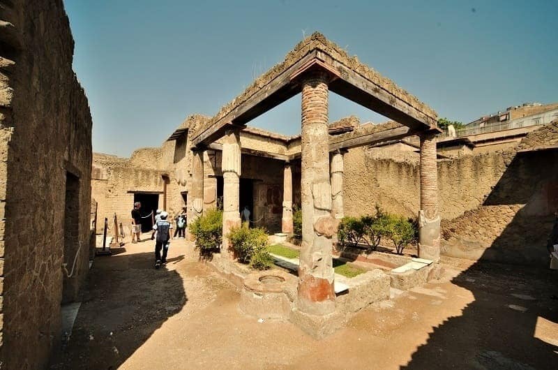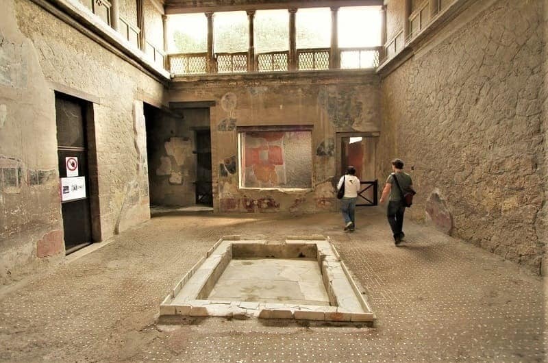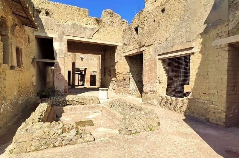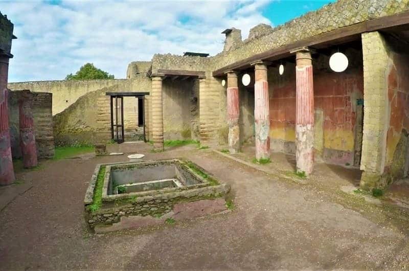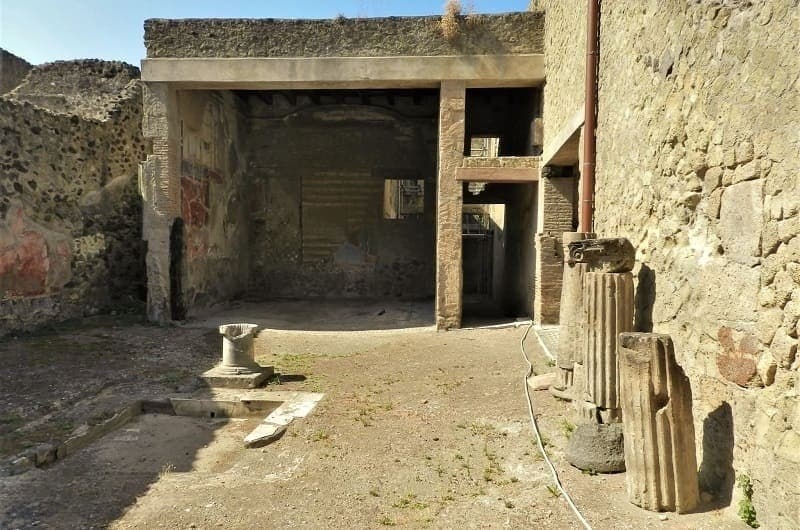 The House of the Corinthian Atrium, one of the oldest in Herculaneum, is characterized by an atrium with Corinthian brick columns and a cocciopesto floor with marble chips.