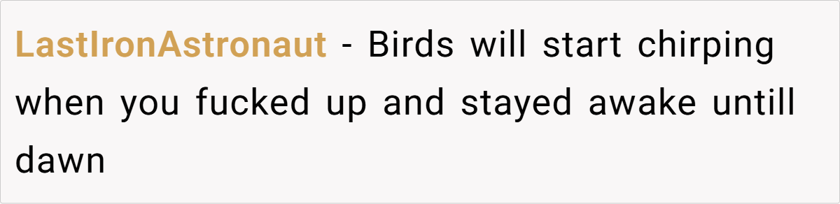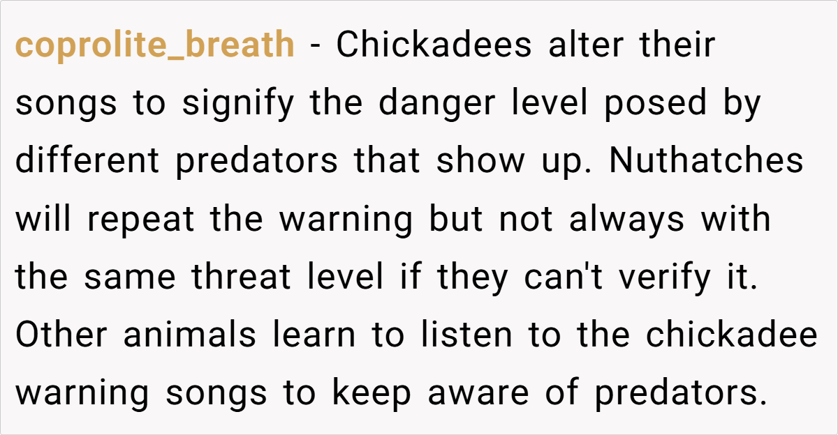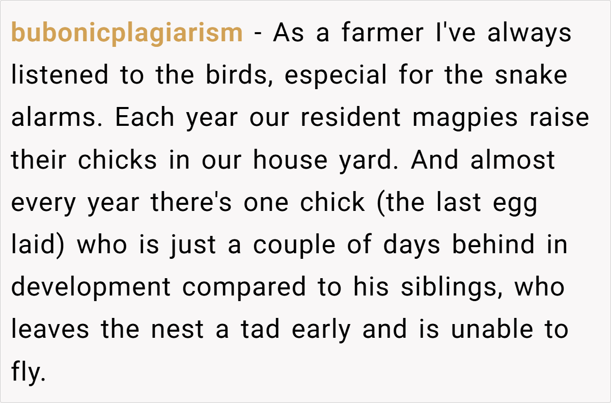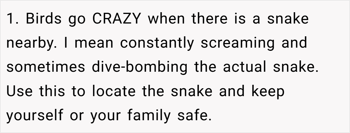 The Reddit community has weighed in with a mix of amusement and genuine insights. From fascinated remarks about birds’ “snake alarms” to humorous quips about birds chirping about personal mishaps, these comments add a lively dimension to the conversation. Here are some hot takes from the Reddit community—candid, witty, and thought-provoking. These opinions, while entertaining, remind us that nature’s signals can spark a spectrum of interpretations.