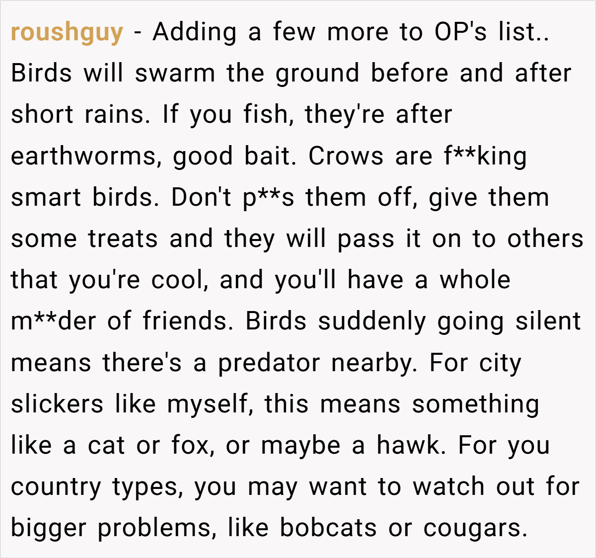 In today’s fast-paced world, reconnecting with nature’s subtle cues can be both fascinating and practical. Imagine gaining a heads-up about an approaching downpour or even a lurking predator simply by tuning in to the birds’ chatter. This intriguing Reddit post dives into the unexpected wisdom that birds share, inviting us all to listen a little closer to the world around us.