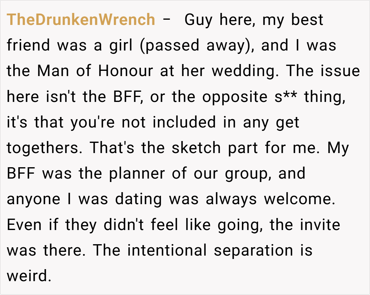 Further examining the situation reveals that the partner’s behavior—such as not including the OP in social gatherings and the mysterious wedding mishaps—may indicate a reluctance to truly integrate lives. Such behavior often breeds isolation and fuels suspicions, making the healthy sharing of emotional space even more crucial. It’s essential for individuals to discuss boundaries and expectations early on, so that what might seem like harmless fun doesn’t evolve into actions that erode trust over time.
