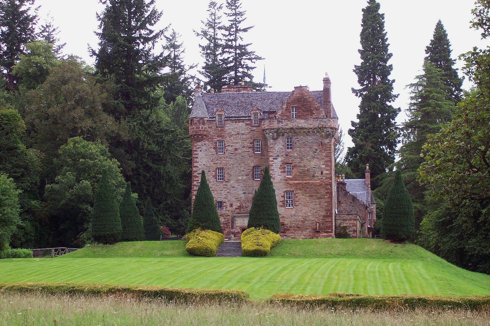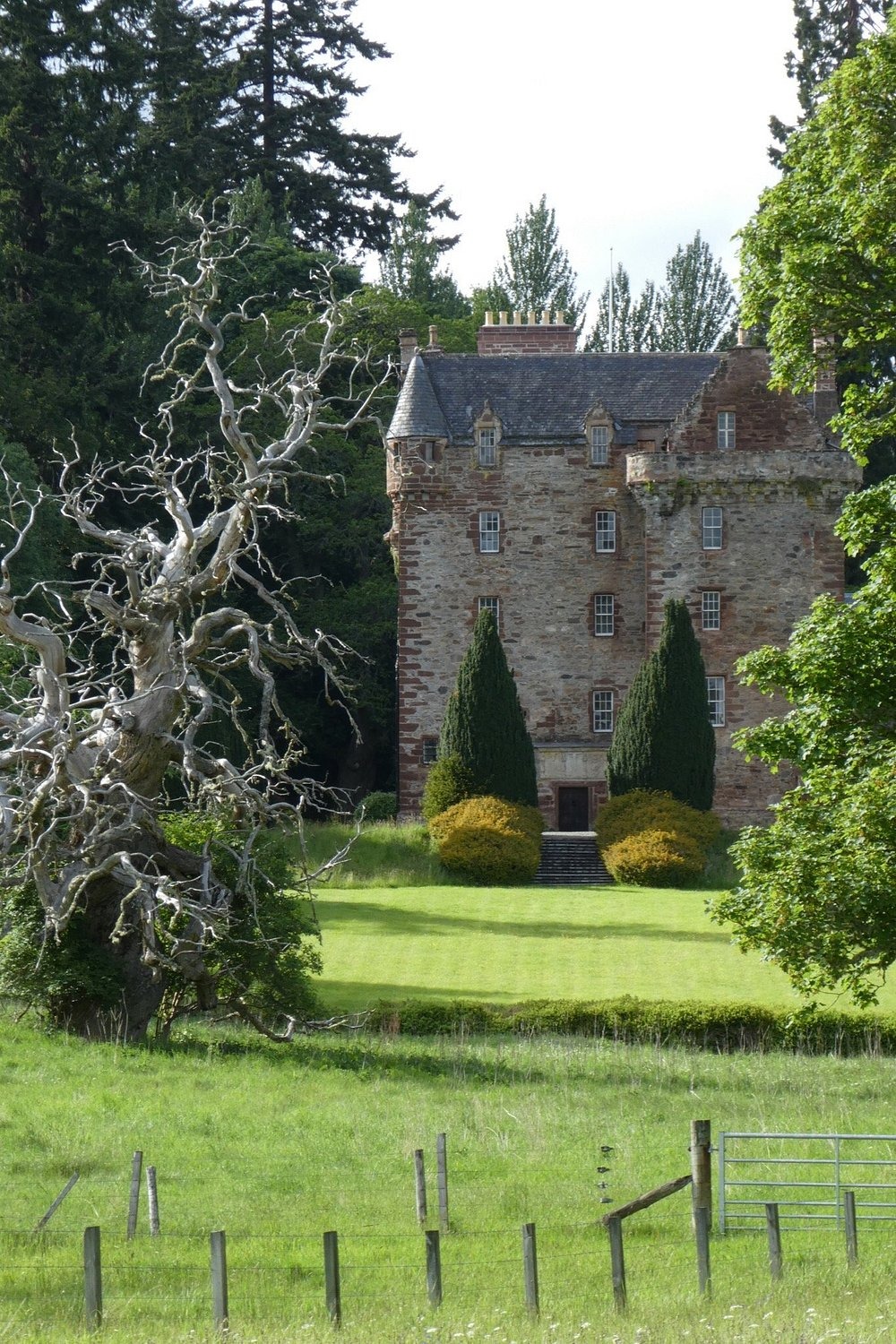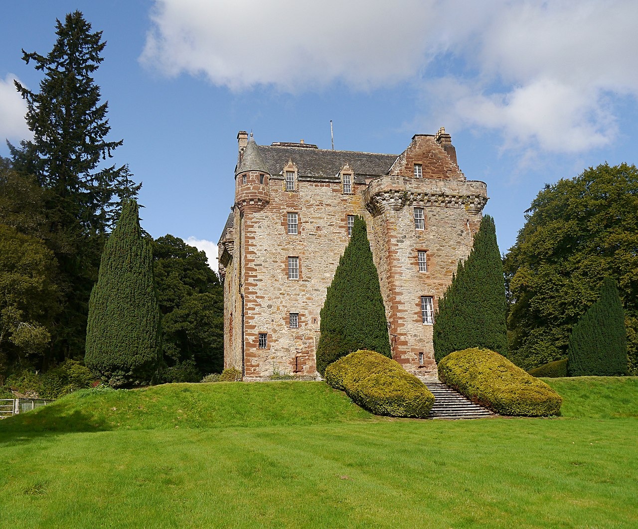The castle’s oldest section, a compact L-Plan tower house constructed from red sandstone, dates back to the 15th century.