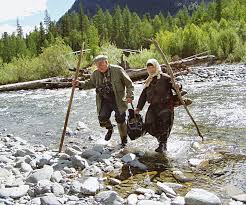 Agafia Lykova and journalist Vasily Peskov going across the Yerinat River, 2004