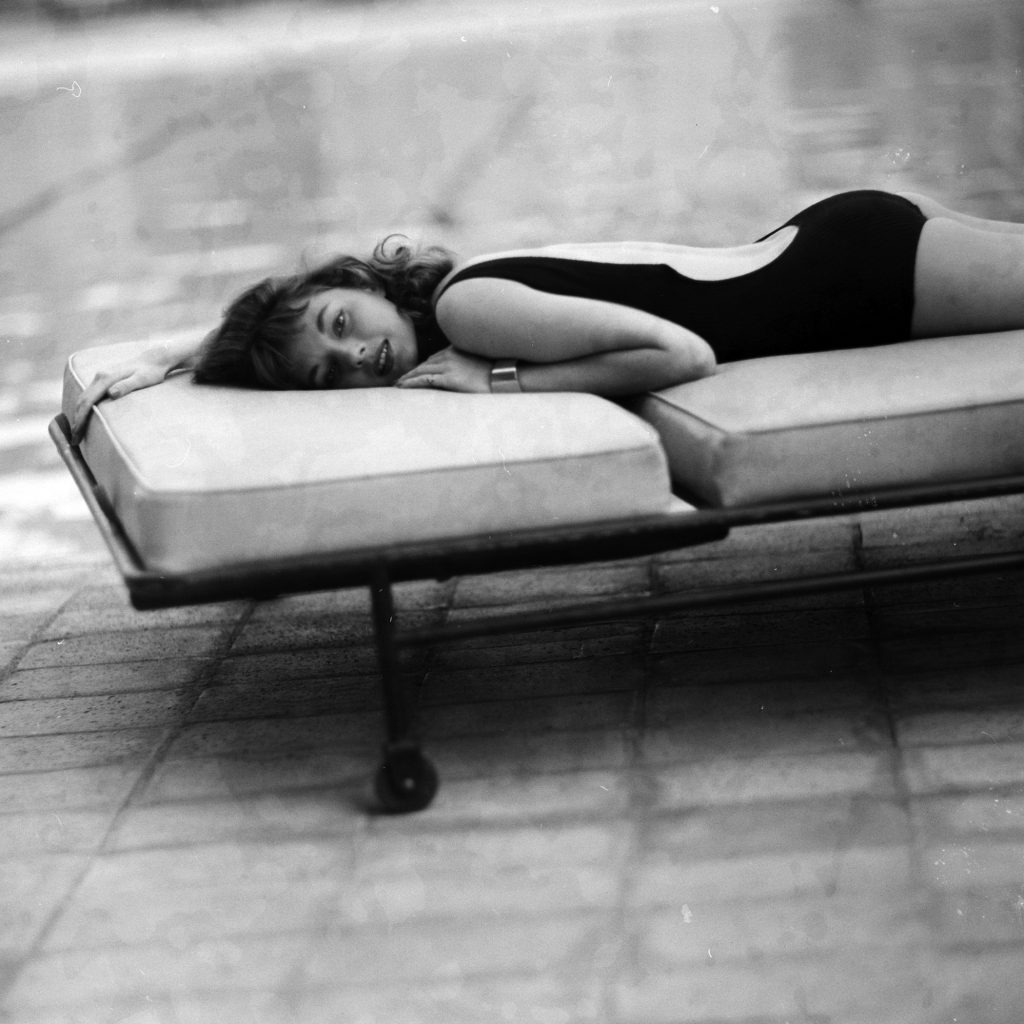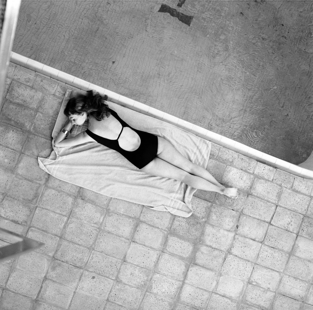 17. Vikki Dougan lounging poolside in a black backless swimsuit