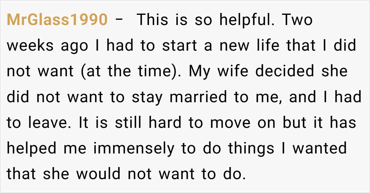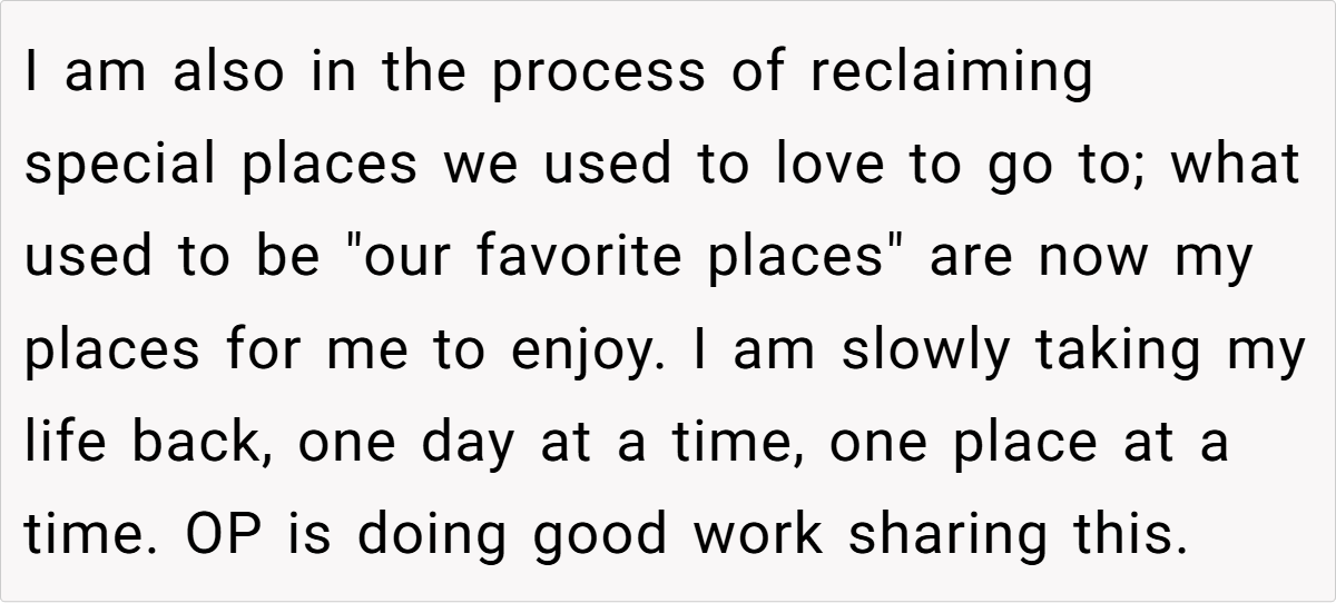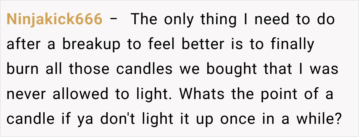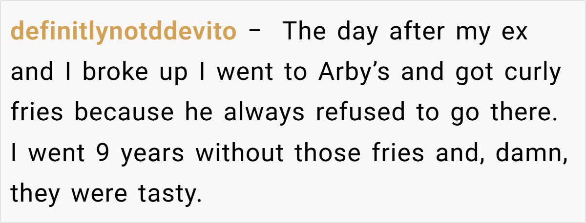 Here are some hot takes from the Reddit community—candid, humorous, and refreshingly relatable. Readers have chimed in with everything from witty one-liners about reclaiming favorite indulgences to heartfelt stories of rediscovery after loss. These diverse reactions remind us that while every breakup story is unique, the quest for self-empowerment is a universal journey.