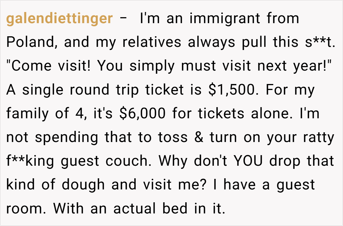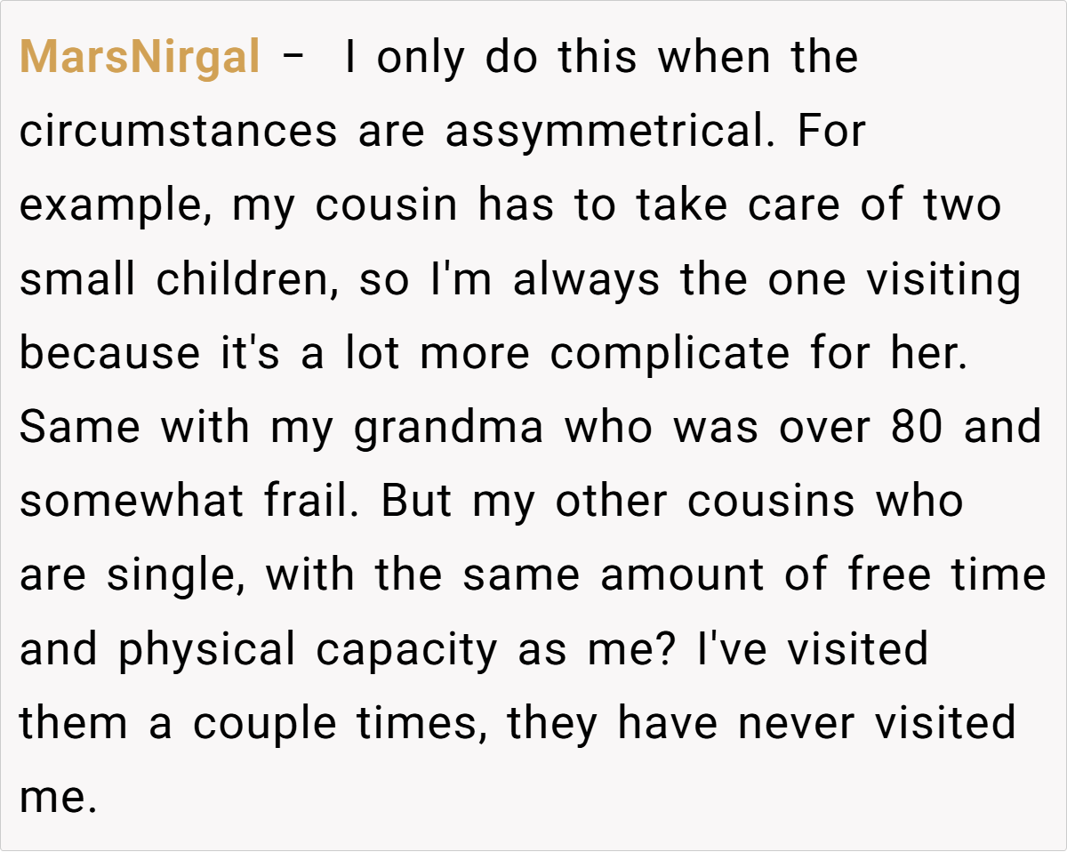 Overall, the Reddit community shares a clear consensus: relationships should be a two-way street. Many users humorously and candidly express their frustration with the unspoken rule that one must always be the one to travel for visits, even when the effort is clearly one-sided.