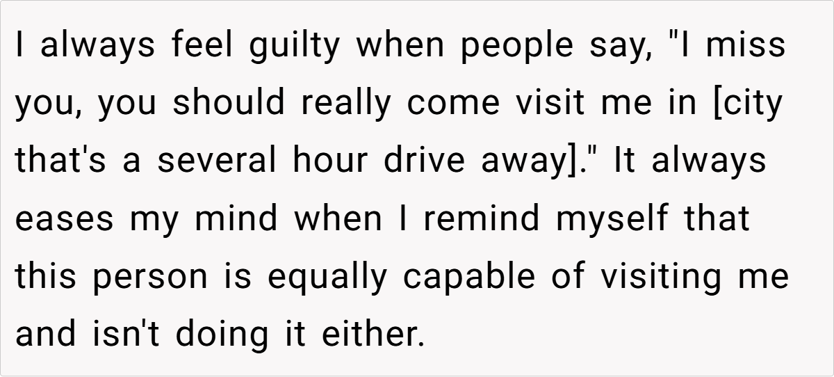 Ever feel that twinge of guilt when someone says, “I miss you—come visit me!” especially when the drive is several hours away? It’s a familiar tug-of-war between politeness and practicality. Often, we end up feeling obligated to visit, even when it’s not really fair. After all, if they want to see you, they can make the effort too. That realization can be both liberating and a wake-up call to balance relationships more equitably.