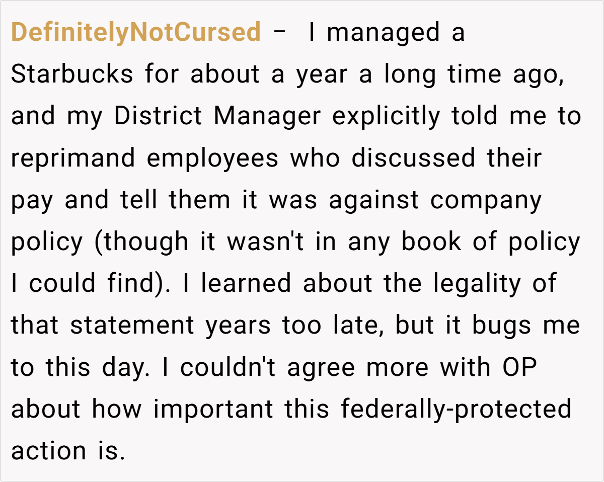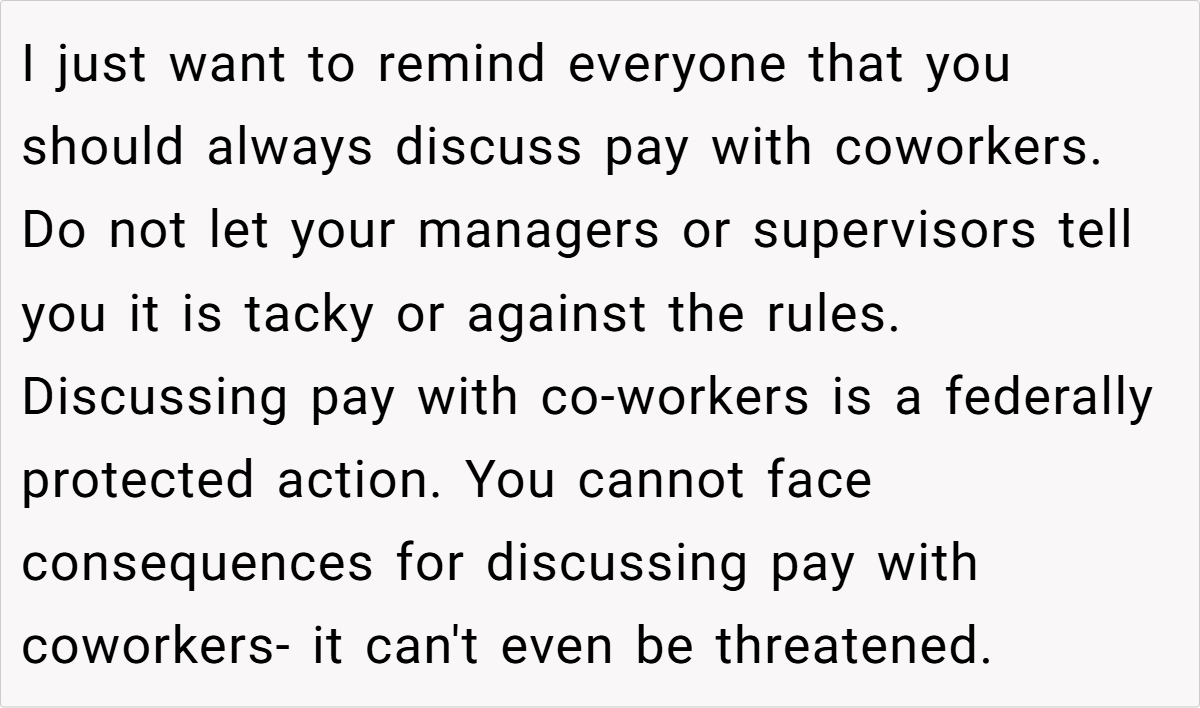 ‘LPT: There is nothing tacky or wrong about discussing your salary with coworkers. It is a federally protected action and the only thing that can stop discrepancies in pay. Do not let your boss convince you otherwise.’