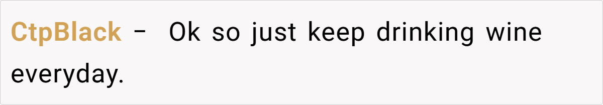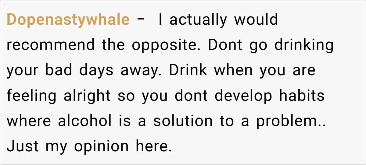 Here are some hot takes from the Reddit community—candid, humorous, and refreshingly blunt. The responses range from “just keep drinking every day” to thoughtful warnings about using alcohol as an escape. These diverse opinions, though sometimes tongue-in-cheek, remind us that life’s complexities often invite a mix of advice and laughter.
