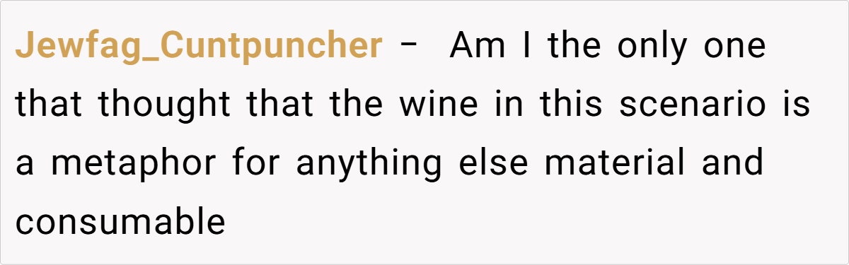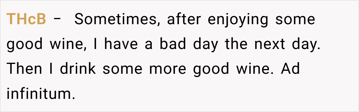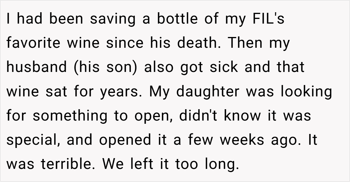 The mishandling of a sentimental vintage mirrors a common human tendency: deferring joy for an elusive ideal. The original poster’s regret is palpable as a bottle meant to honor family legacy becomes a symbol of missed opportunity. This scenario satirically exposes our cultural obsession with perfection, inviting readers to question if waiting for the “right time” might actually rob us of life’s true flavor.