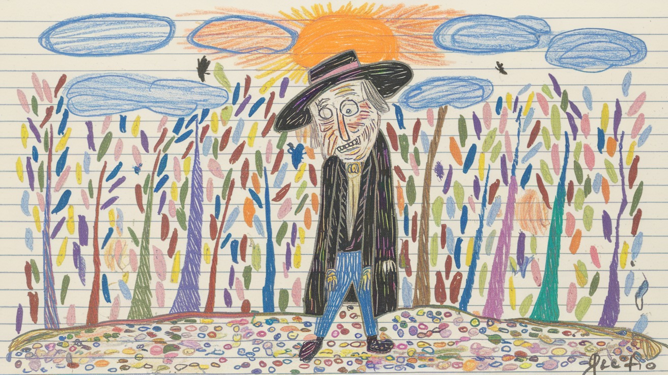 The man in the drawing had a gaunt face, hollow eyes, and an eerie smile—not exactly friendly, but not outright scary either. He wore a wide-brimmed hat, a long coat, and stood in a misty, indistinct background.