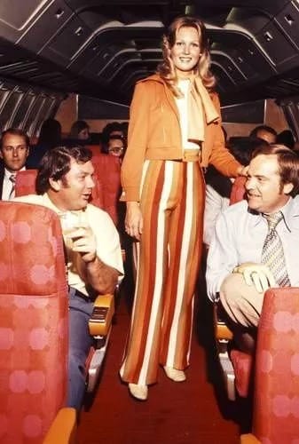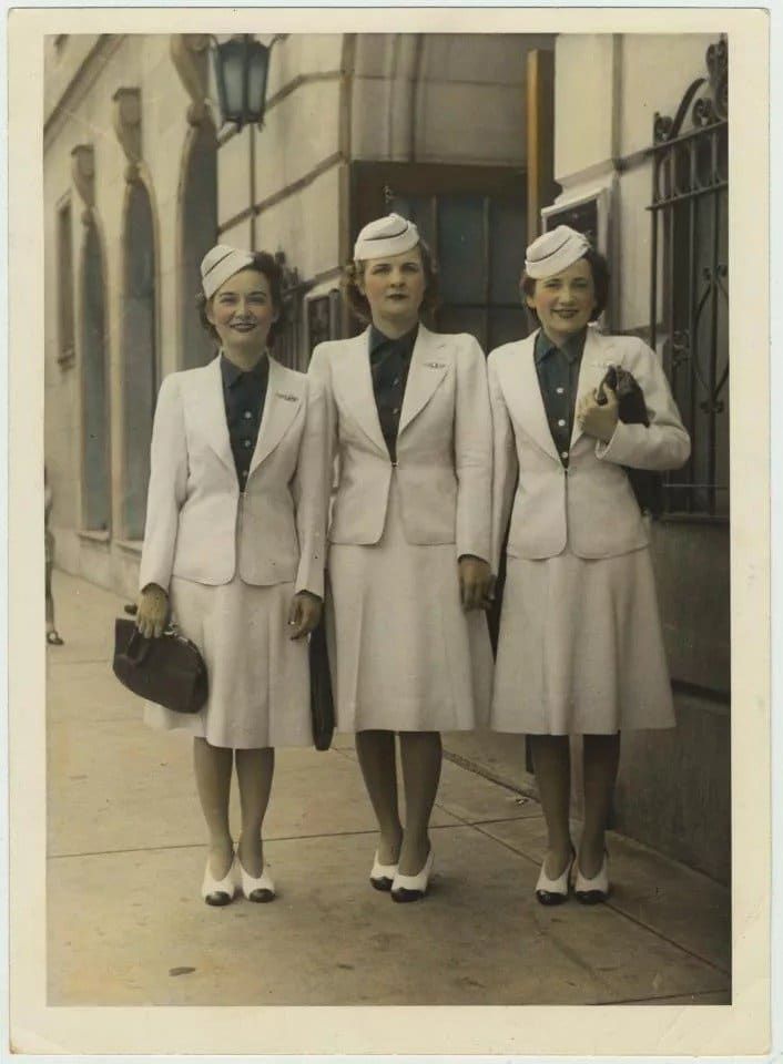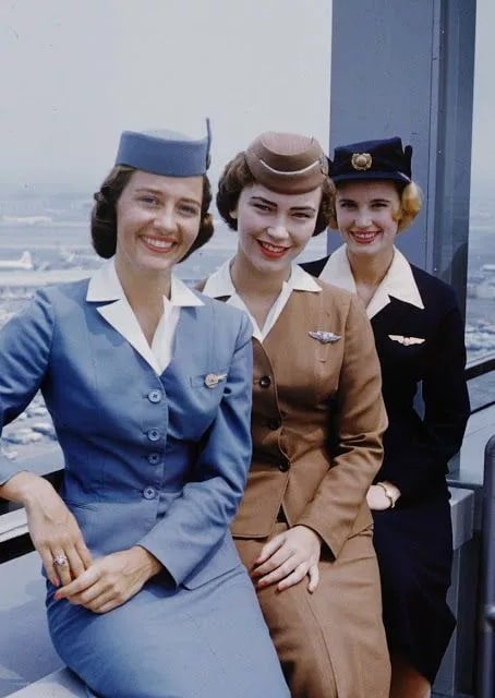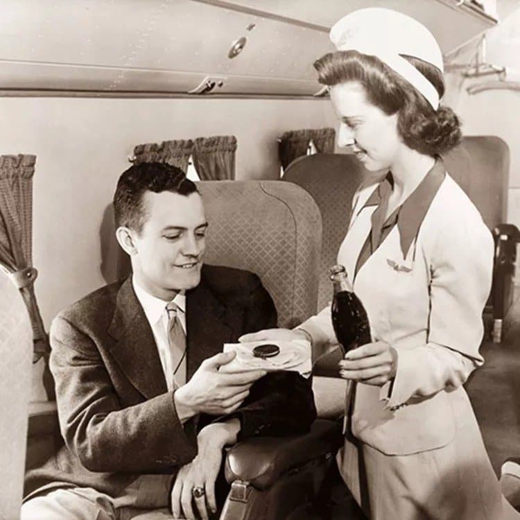 When lying was a special experience, passengers dressed their Sunday best. Flight attendants matched this elegance with tailored suits or dresses, often complemented by stylish hats. This formal and glamorous atmosphere defined air travel during that era.