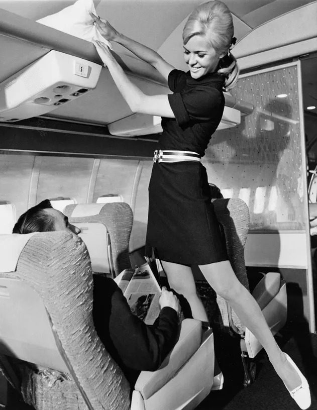 In 1968, Southwest Airlines introduced flight hostesses in go-go boots and belted miniskirts, branding themselves as the “love airline.” They served “love bites” and “love potions” to attract businessmen to cheaper flights with better service. The image shifted from housewife-to-be to playful sky hostesses.