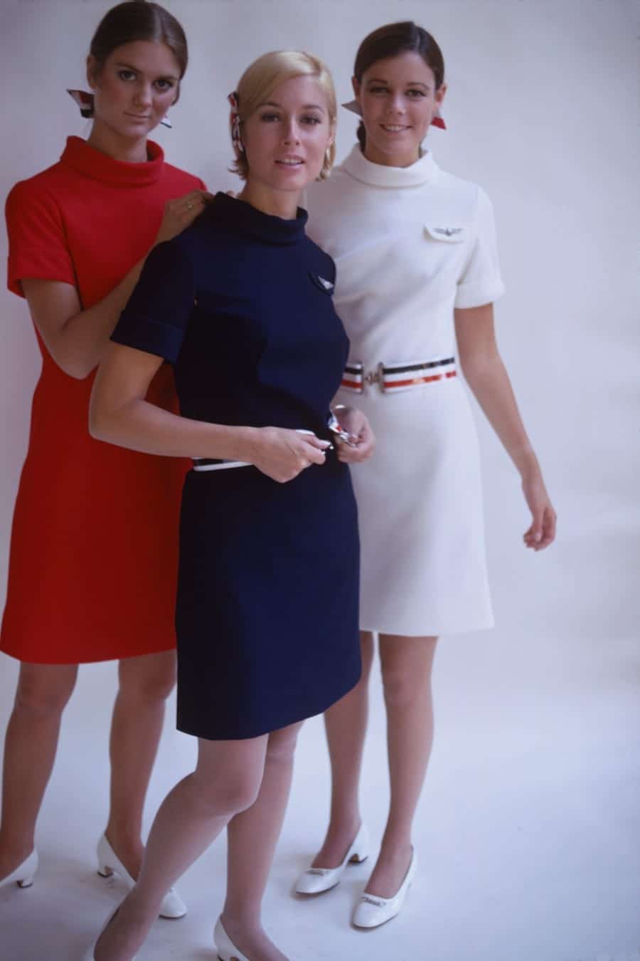 A trio of American Airlines flight attendants posed on an airport tarmac in the new tri-colored uniforms, which caught the public’s eye through a wide-reaching national campaign. The uniforms featured red, white, and blue sheath dresses accessorized with matching belts and hairbows.