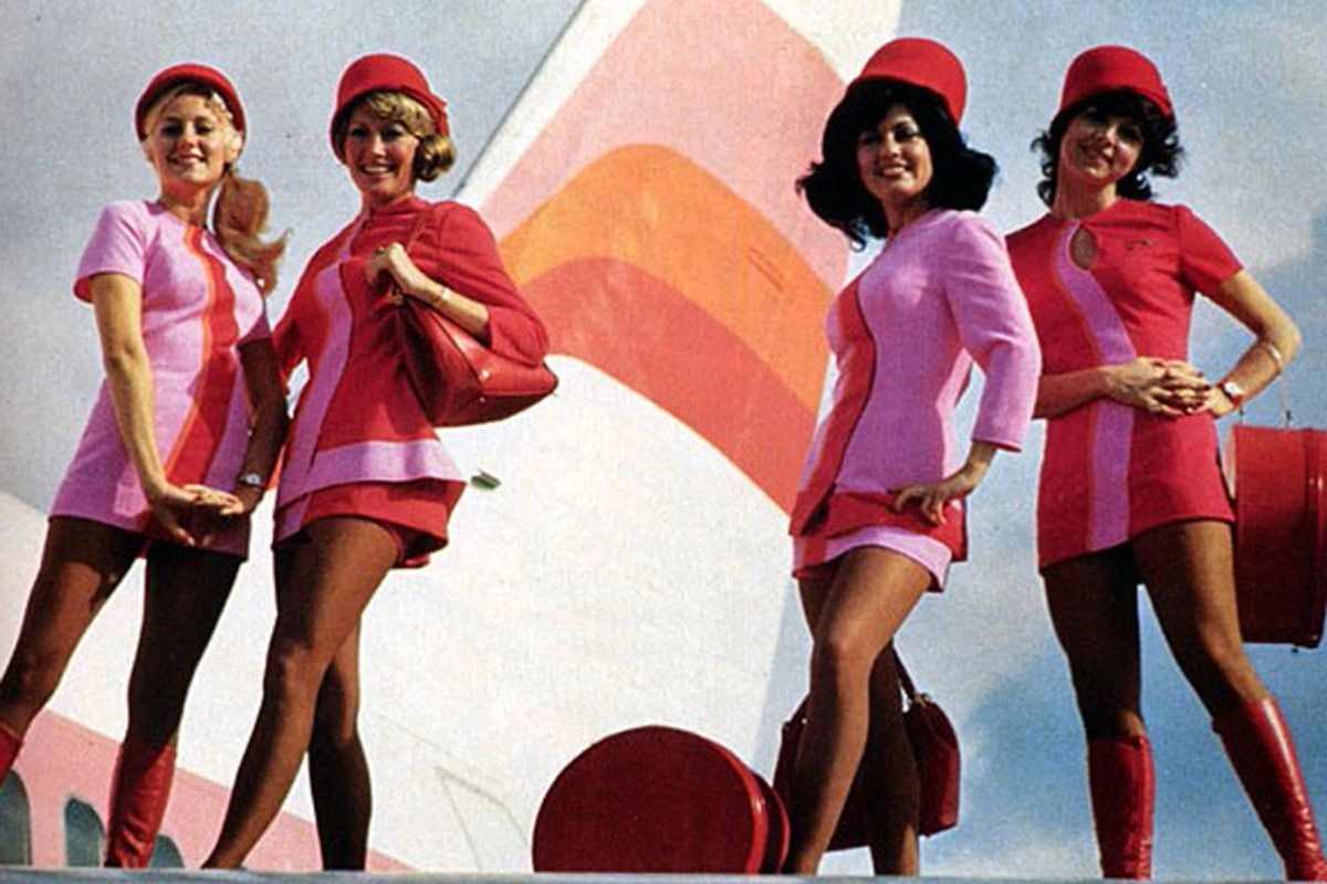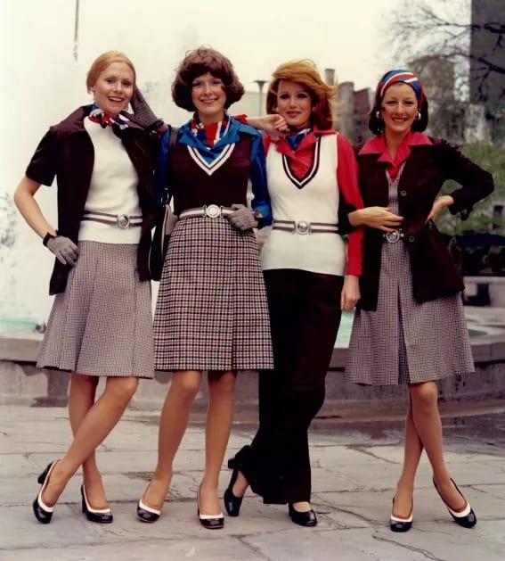 At the beginning of the 70s, Southwest Airlines debuted bright uniforms for their flight attendants, featuring tall white go-go boots and matching white belts that added flair to the short hemlines.