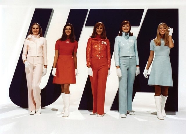 In 1968, Pierre Cardin was tasked with designing the uniforms for UTA Airlines. The French-Italian designer infused his creations with influences from his own “Cosmos” collection.