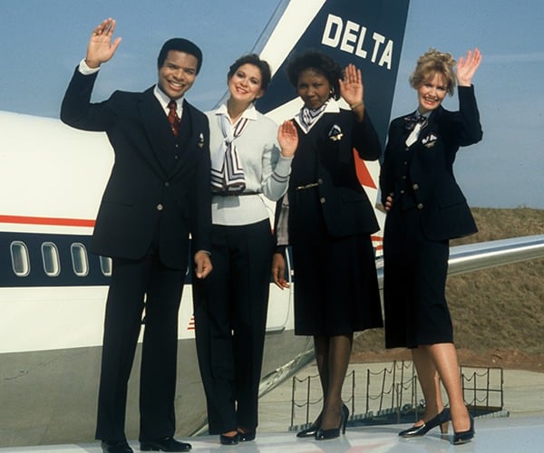 Delta introduced its first uniform with maternity wear during this decade. The flight attendant image shifted from a glamorous “Playboy Bunny” look to that of a safety professional, with androgynous pantsuits and blouses becoming common.
