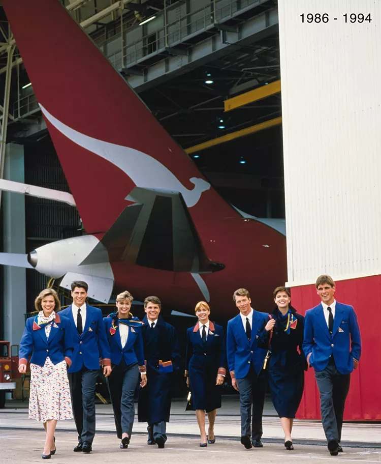 After the vibrant 1970s, Qantas returned to a more classic color palette, featuring loose-fitting looks with touches of its signature red.