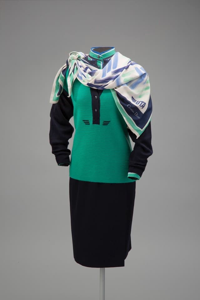 In 1973, André Courrèges designed new uniforms for the UTA flight crew. His collection for the airline included skirts, straight-leg trousers, fitted sweaters, and short jackets made from faux leather.