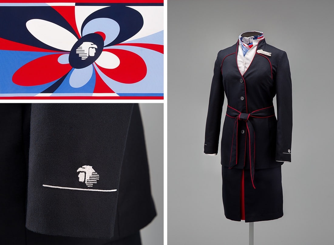 In this period, airlines embraced bold colors and patterns. Pan Am introduced its first above-the-knee hemline and bold color choices of Superjet Blue and Galaxy Gold.