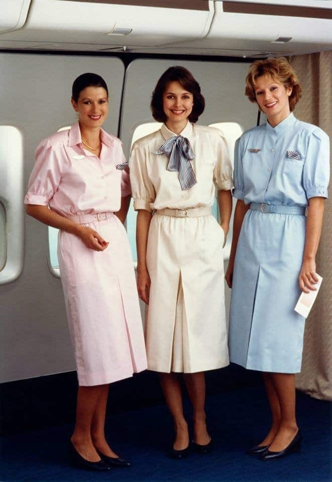 In the late 80s, Air France flight attendants adopted pastel summer dresses designed by Louis Féraud, featuring shoulder pads and optional large loose bows.
