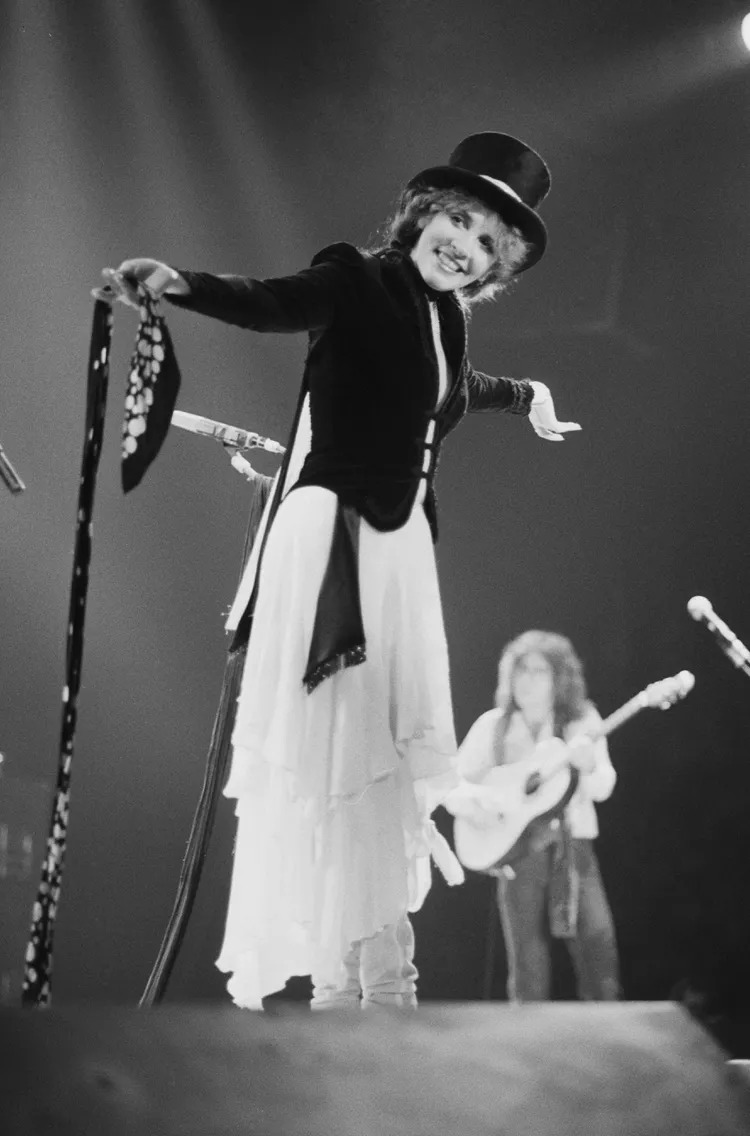 Stevie Nicks would add a touch of magic to her outfits with a top hat, an unexpected accessory that gave her feminine, frilly looks a subtle masculine edge.