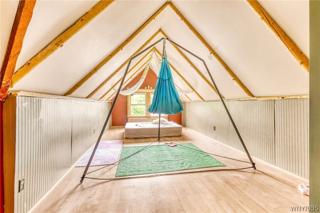 The primary bedroom is spacious and has an attached sleeping porch, offering a cozy retreat.