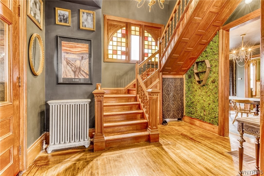 As you enter the house, A magnificent wooden foyer immediately catches your eye. It is adorned with leaded stained-glass windows.