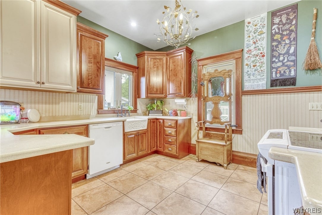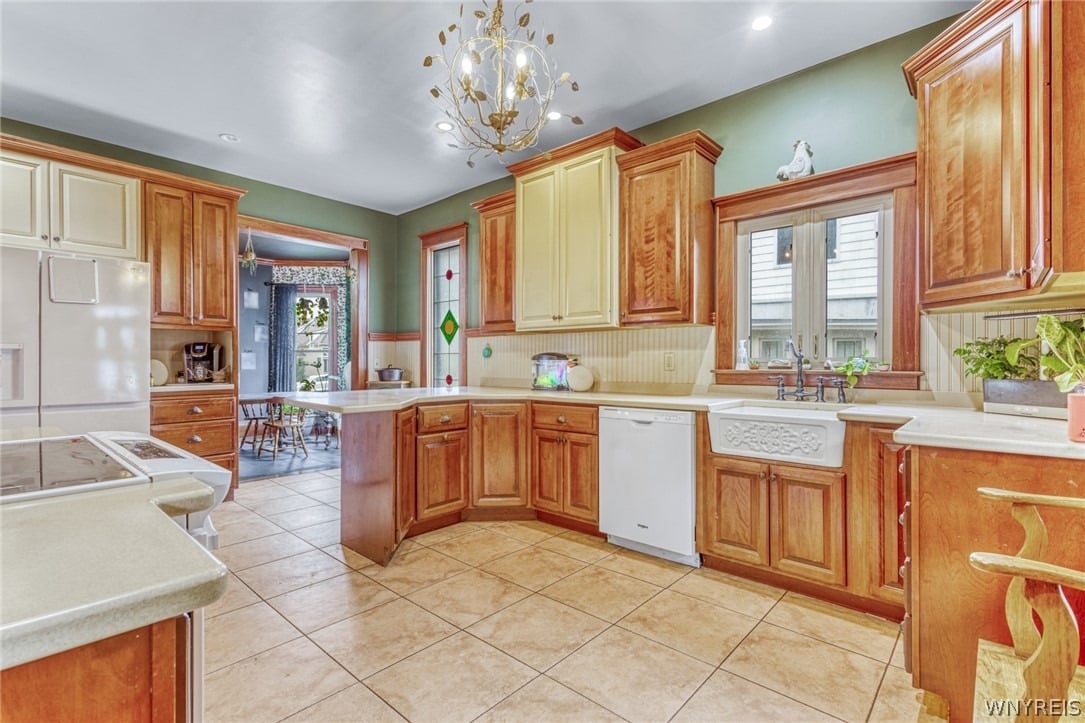 The spacious kitchen features Corian countertops, a farmhouse sink, and a central island.