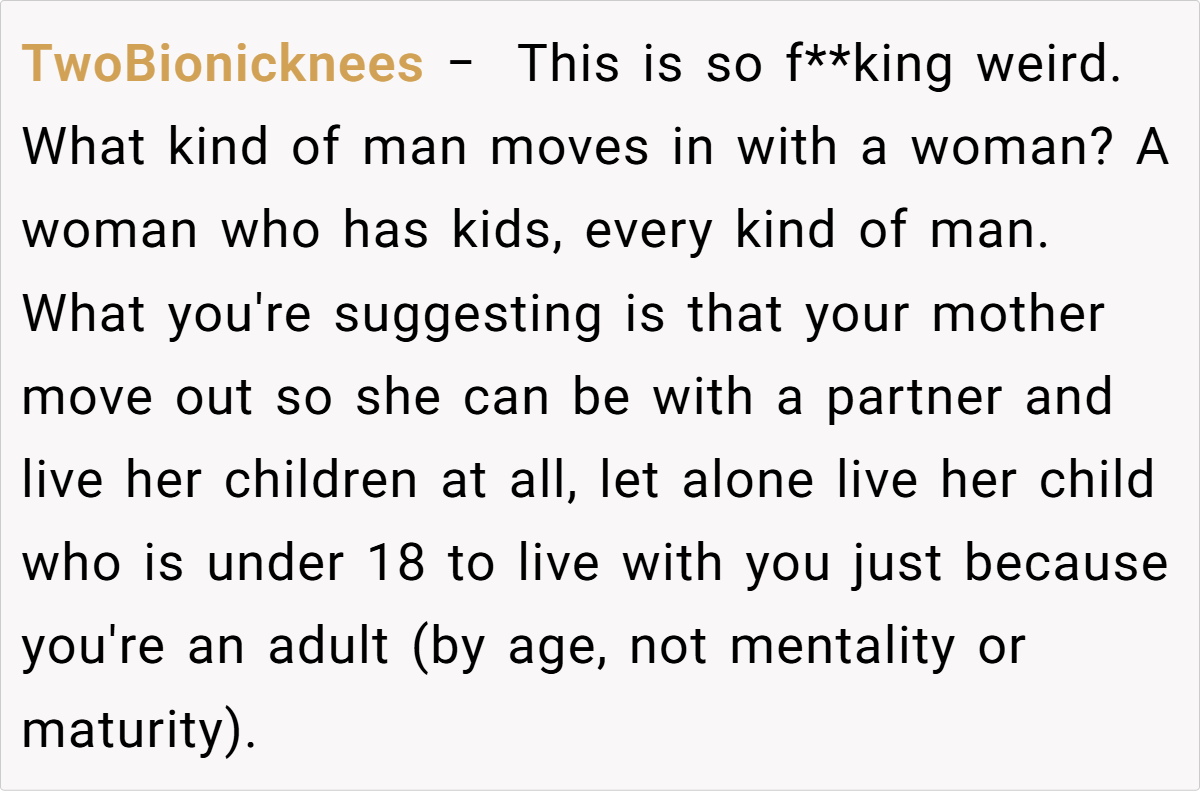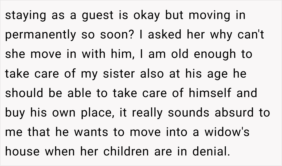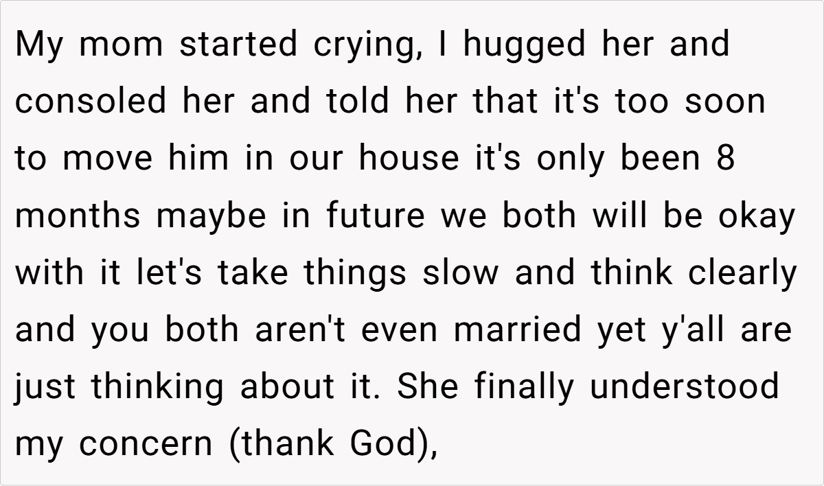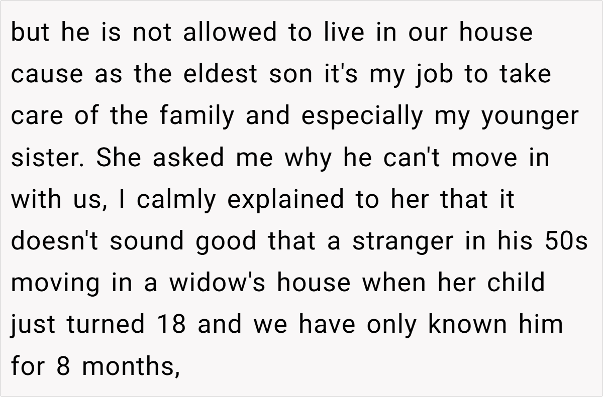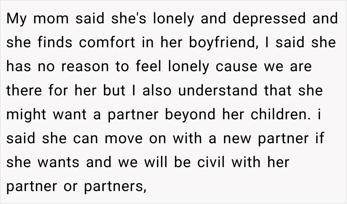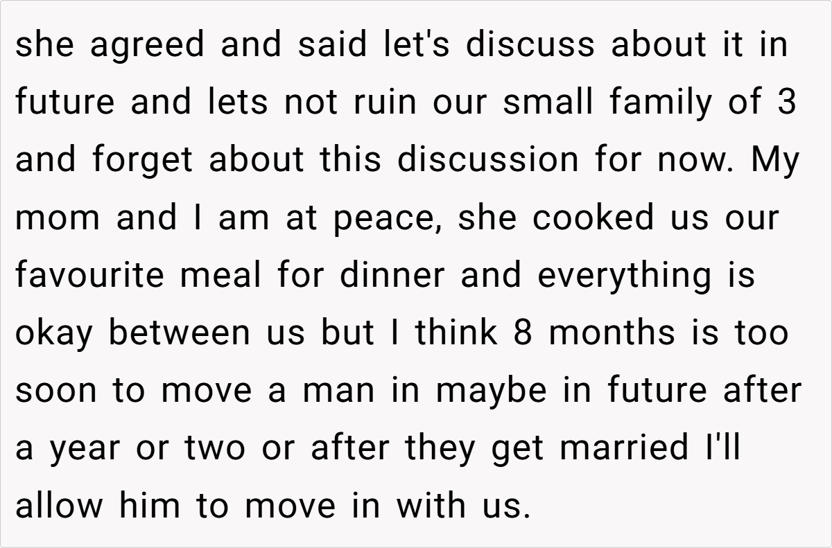 Some commenters point out that while his mother’s need for companionship is understandable, moving in with a new partner so quickly—especially when it involves long-held family property—can feel like a betrayal to the legacy of the deceased.