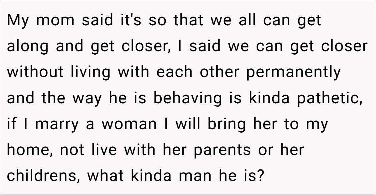 Reddit users have shared a range of perspectives on this situation. Many sympathize with the storyteller’s concern for maintaining a stable family environment after a loss and applaud his courage in setting boundaries.