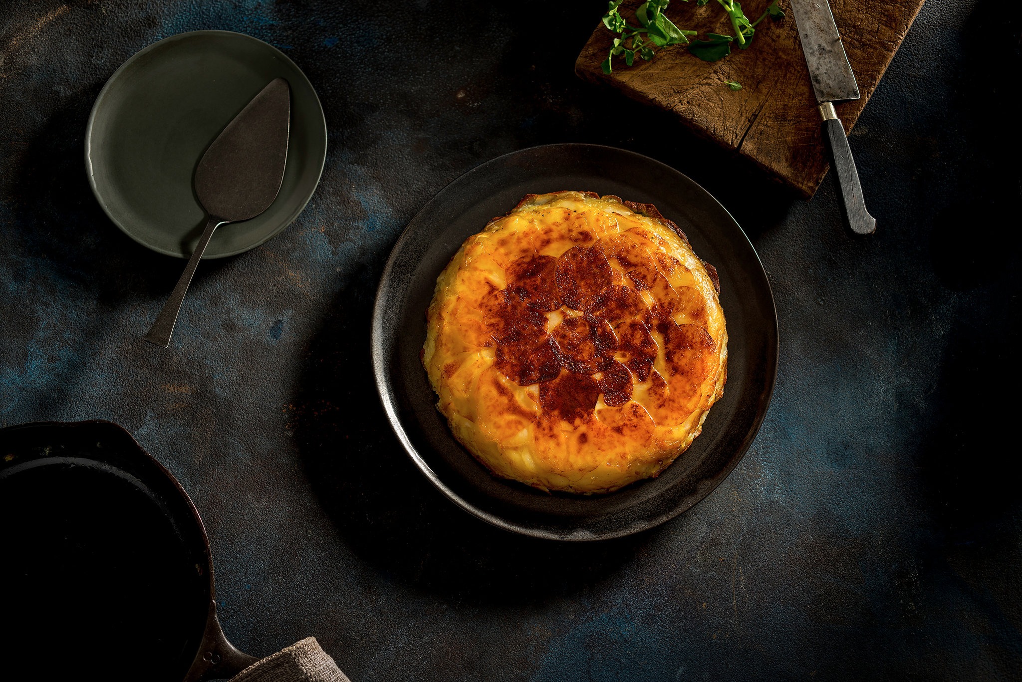 The method involves layering potatoes in a buttered dish, seasoning with just salt, and baking until the result is a cake-like formation with a crisp, golden exterior and a tender, buttery interior.