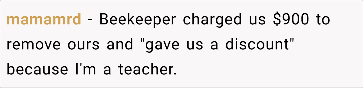 The discussion reflects a broader societal debate on human intervention in nature, questioning whether convenience should ever trump environmental stewardship. By opting for a beekeeper, the original poster not only saved money but also contributed to the well-being of the bees, fostering a small but significant shift in how urban wildlife is managed.