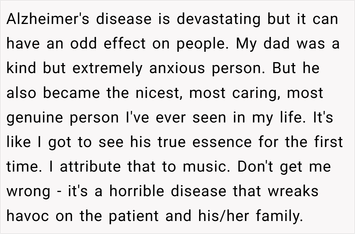 ‘LPT: if a friend or a family member gets diagnosed with dementia or alzheimer, in the early stages try to find out what their favorite songs of all time are. In this way you would be able to create a playlist for them that could be of great benefit in the later stages of the disease.’