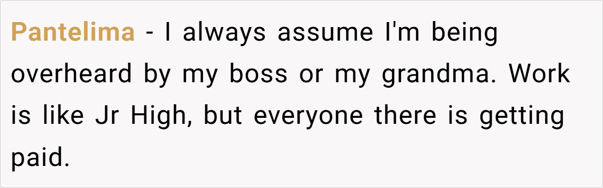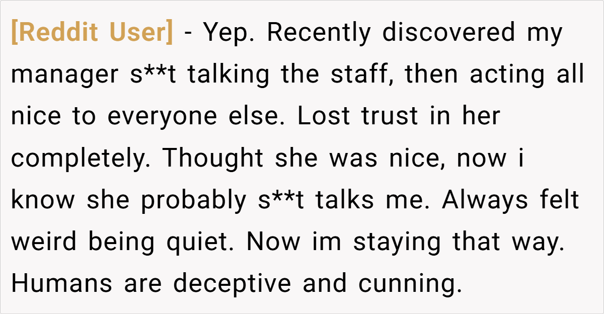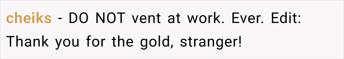 Here are some hot takes from the Reddit community—candid, humorous, and refreshingly blunt. These comments capture a range of perspectives on the perils of workplace venting, from wary cynicism to outright caution. They serve as a humorous yet honest reflection on the delicate interplay between personal disclosure and professional risk.
