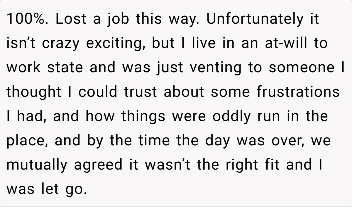 Analyzing the situation reveals that the Redditor’s casual venting led to an abrupt end of their job—a reminder of the high stakes in at-will employment states. Even when sharing seemingly benign observations, the listener’s interpretation and subsequent actions can drastically alter your professional landscape. Such incidents underscore the importance of maintaining clear professional boundaries and being judicious about whom to trust with personal grievances.