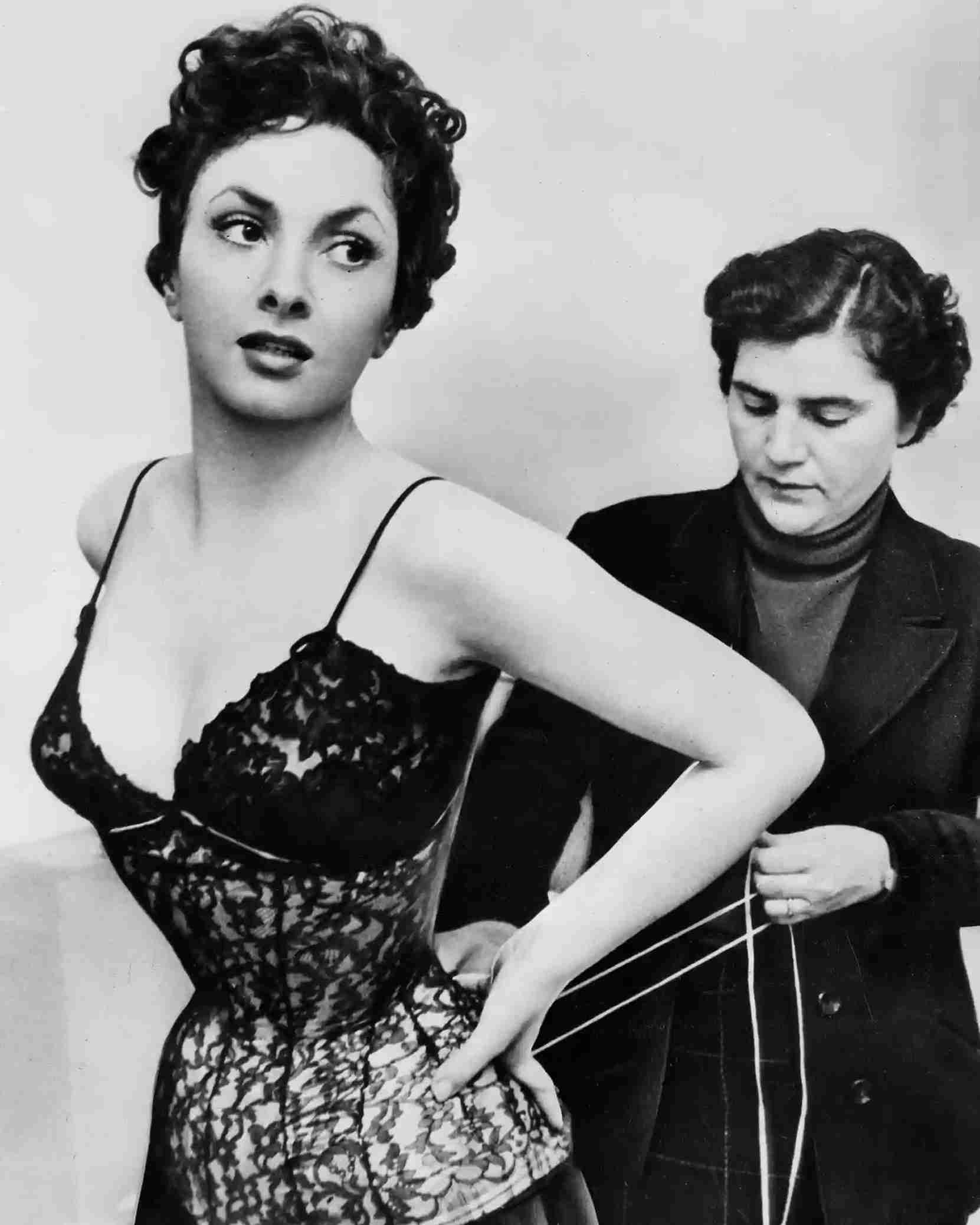 10. A wardrobe assistant helping Gina Lollobrigida get into her corset in 1954